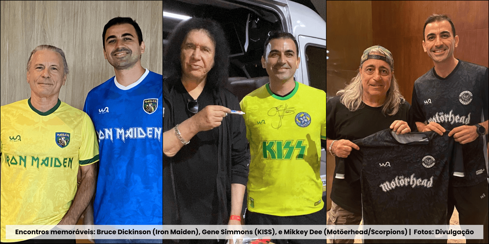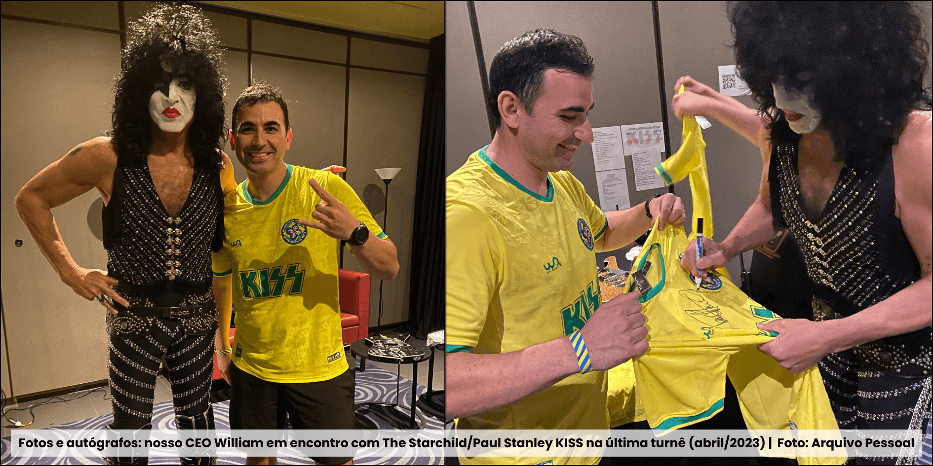 Com a banda Kiss nós tivemos mais do que um encontro para licenciamento. Em 2022, quando tudo ainda era um sonho, e o segundo, na última passagem da banda pelo Brasil (abril de 2023). Na ocasião, adquirimos um item de colecionador - que pertence a todos nós, fãs da banda: a última guitarra quebrada por Paul Stanley em solo brasileiro. Ela está exposta em nossa loja 2, na Galeria do Rock, e chama muita atenção - assim como o Gene Simmons em tamanho natural na porta de entrada.