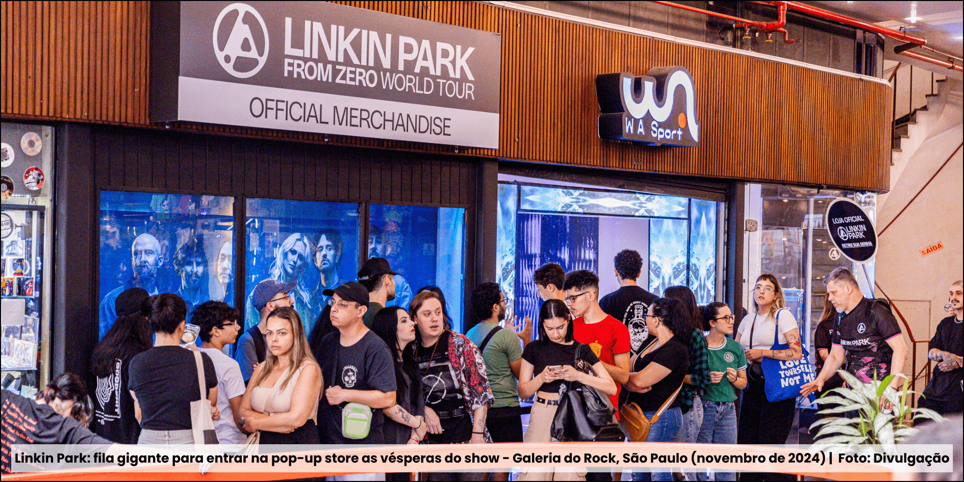 Entre os momentos que merecem destaque, também temos a chegada do Linkin Park ao nosso portfólio, que foi o resultado de uma parceria inédita com a gravadora Warner Music no Brasil. Desenvolvemos e produzimos os itens oficiais em tempo recorde e montamos uma pop-up store exclusiva da banda para o lançamento do álbum From Zero. O trabalho marcou uma nova fase do grupo norte-americano e a vinda do Linkin Park ao Brasil, em novembro de 2024. Foram sete dias de um movimento absurdo na loja e em toda Galeria do Rock, onde fãs do mundo inteiro ficaram cerca de 4 horas esperando na fila para visitar a pop-up store.