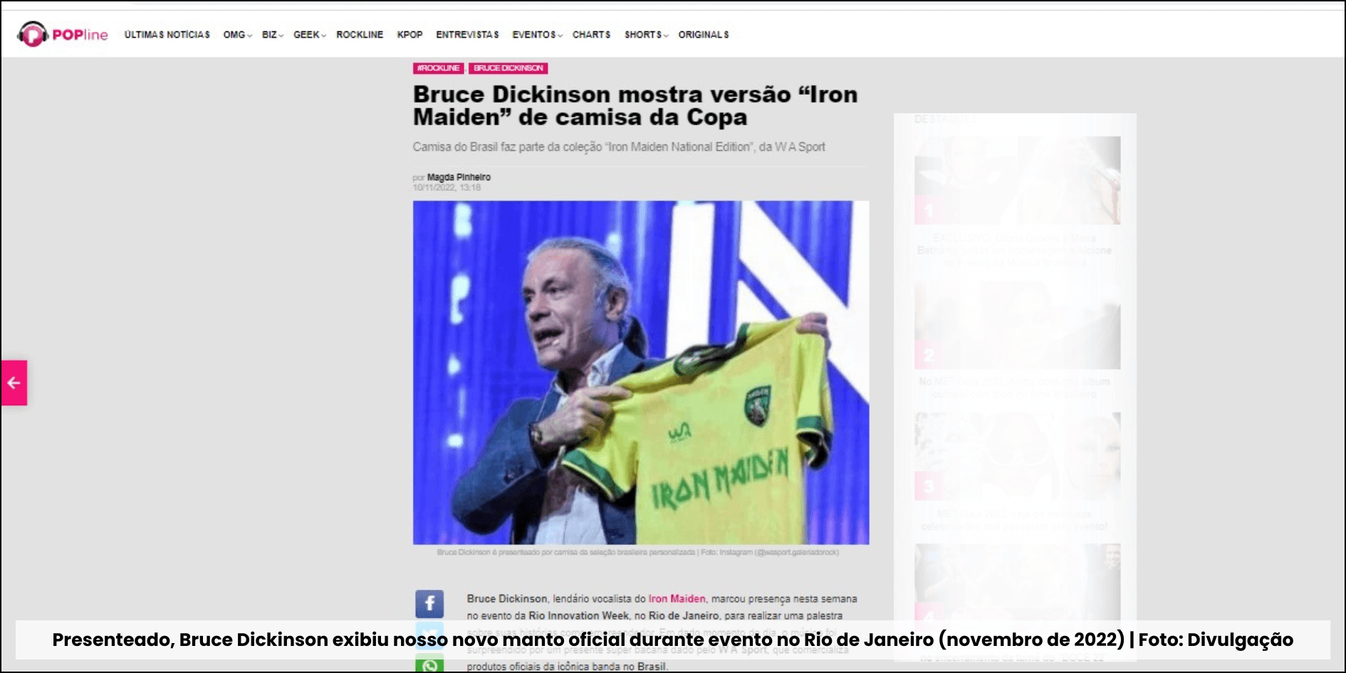 O andamento dessas parcerias comerciais rendeu bons momentos para a nossa marca, inclusive conhecer alguns membros da banda. Em novembro de 2022, durante o Rio Innovation Week, no Rio de Janeiro, Bruce Dickinson fez questão de exibir para todo mundo o nosso presente pra ele (entregue em mãos horas antes): a nova camisa de futebol do Iron Maiden com a temática do Brasil. Mal sabia o vocalista que, naquele momento, acabava de antecipar nosso lançamento.