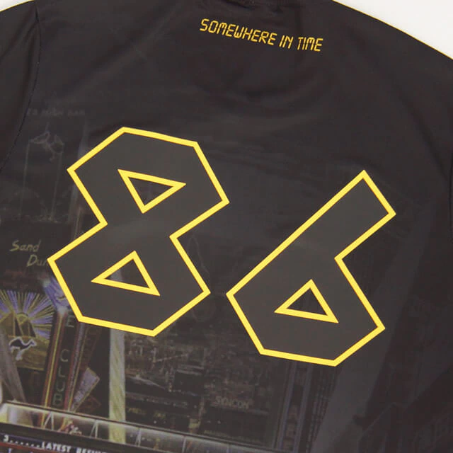 Nas costas da camisa, em destaque, surge a mão do Eddie cyborg do lado esquerdo, além da continuação de parte da ilustração do desenho original. O número 86, correspondente ao ano de lançamento do álbum, é aplicado em adesivo nas cores amarelo e preto. A inscrição “Somewhere In Time”, referenciando o álbum inspiração, vem sublimada na altura da nuca. Completa o modelo o selo de produto oficial - emborrachado em poliuretano - aplicado na frente, junto a barra da camisa, certificando que o fã está adquirindo um produto original e exclusivo, licenciado e aprovada pelo próprio Iron Maiden.