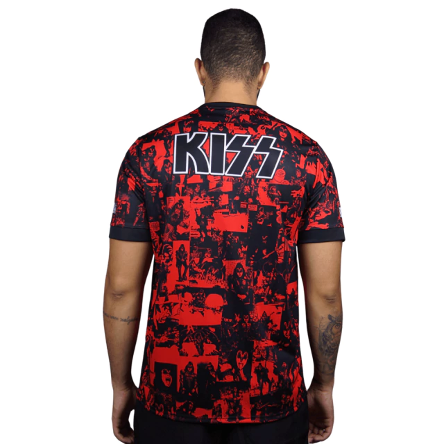 Para The Demon, a camisa de futebol vem com a cor vermelha predominante. Não podia ser outra, não é? E por todo layout usamos toda a nossa criatividade para juntar momentos do cora: tem Gene Simmon por todos os lados, sublimado em preto! Inclusive com direito a imagens inéditas de Demon ao longo da carreira no Kiss.