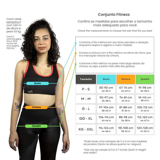 P - S: 83-90cm (busto) - 67-74cm (cintura) - 91-98cm (quadril)